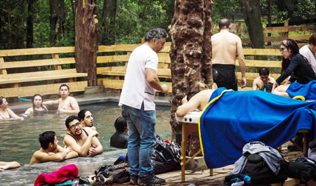 Al finalizar el recorrido los participantes tomaron un merecido descanso en Termas Quilalelfu, lugar donde pudieron disfrutar de las aguas termales del sector y de masajes descontracturantes provistos por los 4 masoterapeutas participes de la actividad.