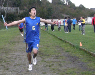 Diego Pinto llegando a la meta en la posta de 4 x 400. En Varones con un espectacular remate después de ir abajo en distancia, una hazaña para no olvidar lo conseguido por el cuadro azul del Centro Educacional Altamira que se quedó con el oro. Belarmino Campos. Pablo Ramírez, Jonathan Rivas y el gran Diego Pinto quien dio con la puntada final para el triunfo. Segundo el Fernando Santiván y el tercer puesto para el Liceo Gastronómico. Hoy miércoles a las 16:00 horas va la maratón y mañana a las 20:00 horas la gala de premiación, con ello se cierran las VIII Olimpiadas Deportivas de Enseñanza Media en Panguipulli. |