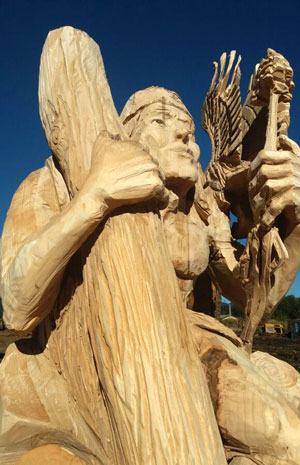 Primer Lugar: Mauricio Pichuante Olguín, de Doñigüe. Premio, $ 1.000.000. Cuenta que cuando llegó a la zona del concurso recorrió todo el aserradero donde se emplazó la actividad, y aprovechó de conversar con muchas personas que le hablaron sobre la vida en el trabajo forestal, de cómo las enseñanzas, los consejos y las experiencias de vida se traspasaban entre trabajadores, de generación en generación, al igual que en el mundo mapuche. “Así que de ahí me vino la inspiración… la escultura nació acá en Neltume”, afirma categórico Mauricio Pichuante. Según detalla, la escultura configura a un mapuche pehuenche arrancando un árbol con la mano derecha para luego usarlo en sus labores, y con la mano izquierda está plantando una araucaria, que también puede ser un coigüe de raíz larga, “de acuerdo a los ojos de quien lo mire”, señala Pichuante. Sobre la cabeza hay un águila que simboliza la libertad, y al lado derecho una media luna que representa el tiempo que usaban los indígenas para orientar cultivos y cosechas, como una guía del cosmos, “y que tiene que ver directamente con la sabiduría mapuche”, asegura. Para Eugenio Salas, jurado del concurso y asesor de la Fundación Huilo Huilo en temas de patrimonio ancestral, la convocatoria no puso énfasis en la competencia, en los premios, fue apenas una excusa para reunir a los participantes en un acto de generosidad de todos ellos, y del compromiso que tiene la fundación con el territorio. “Tenemos un paisaje extraordinario: cordilleras, ríos, lagos, naturaleza. Entonces, ese paisaje natural, para profundizarlo, para hacerlo escalar tenemos que agregarle el paisaje cultural. Cuando tú vez esculturas desplegadas en un aserradero, este lugar deja de ser un aserradero y se transforma en un espacio patrimonial, con obras instaladas ahí generosamente por sus autores que lo dejan para la gente de la zona y la región, para los visitantes”. PASO A PASO