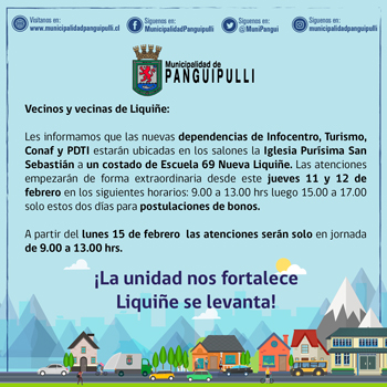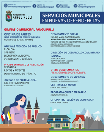 Rodrigo Valdivia Orias, Alcalde de Panguipulli. 12/02/2021 - Fotografía Archivo “Los equipos han trabajado a toda velocidad para, por un lado, realizar la limpieza de los escombros del incendio y, por otro lado, habilitar el gimnasio municipal, lo que permite que hasta hoy hayamos podido retomar el 90% de los servicios y atenciones a la comunidad. Ahora solo resta poder restablecer la conexión a internet y rearmar el servidor para poder lograr el 100% de los servicios”, detalló el alcalde. Valdivia también aprovechó de agradecer el compromiso y trabajo de los y las funcionarias quienes han realizado un arduo trabajo en los últimos días. "Realmente me siento muy agradecido del trabajo y compromiso de los equipos en todas las áreas, quienes una vez más han demostrado toda su vocación con sus funciones de servicio público y responsabilidad con su labor", destacó el edil. SERVICIOS EN PANGUIPULLI SERVICIOS EN LIQUIÑE |