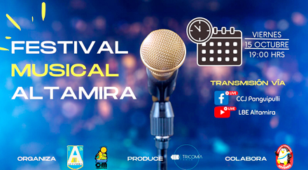 15/10/2021 En este primer certamen, entrarán en competencia solo estudiantes de la comunidad altamirana, no obstante, se espera que en versiones futuras puedan participar alumnos y alumnas de todos los liceos y escuelas que pertenecen a la Corporación Municipal de Panguipulli. Con las categorías canto e instrumental y la participación de nueve estudiantes de distintos cursos y niveles, la final de este festival tendrá lugar este viernes 15 de octubre en las instalaciones del establecimiento y desde las 19:00 horas. La invitación es a seguir la transmisión del evento vía streaming y por medio de las plataformas Youtube, Facebook e Instagram y de esa forma motivar a los demás establecimientos a participar en futuras audiciones. Colaboran con la realización del certamen el Consejo Consultivo de Jóvenes de la comuna de Panguipulli y la productora Tricomía. Gestores y organizadores: Los profesores de música Miguel Jaque y Aarón Jaramillo. CATEGORÍA CANTO * Florencia Pardo – 8°B CATEGORÍA INSTRUMENTOS * Tomás Campos – 8°A (Guitarra eléctrica) El link para seguir la transmisión en vivo es: https://youtu.be/W4Bm4fMWi_c |