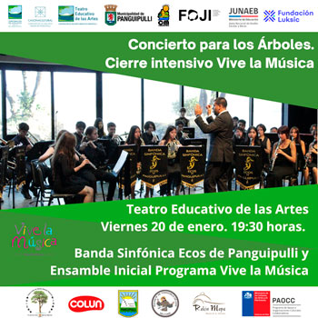 El viernes 20 de enero a las 19:30 es el turno de la Banda Sinfónica y el Ensamble Inicial del Programa Vive la Música, que se presentarán en la ya séptima versión del “Concierto para los Árboles” y que significará el cierre del Intensivo de Verano del programa.