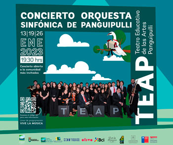 El jueves 19 de enero a las 19:30 horas se realizará la segunda presentación de la Orquesta Sinfónica de Panguipulli en conjunto con la Orquesta Sinfónica Juvenil Regional de Los Ríos, quienes han tenido la oportunidad de ensayar en conjunto durante el Intensivo de Verano del