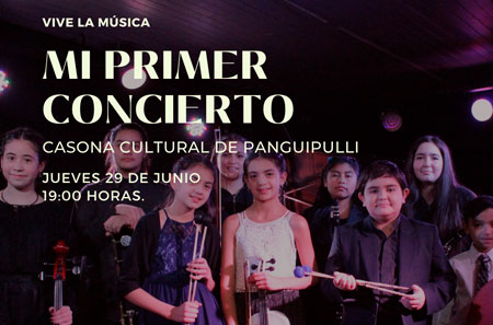 Este jueves 29 a las 19:00 horas, en la Casona Cultural de Panguipulli, se realizará “Mi Primer Concierto” presentación que tiene la finalidad de dar a conocer el trabajo y el proceso de aprendizaje que tienen los niños y jóvenes durante el primer semestre.