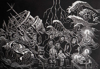 La propuesta visual comprende la recopilación y selección de una serie de obras figurativas de aconteceres y tragedias vividas en Corral, como naufragios o el terremoto de 1960. Son siete piezas de diferentes formatos: 6 de ellas materializadas a través de técnicas de grabado y una al óleo, expresión contemporánea de un collage pictórico, que con la expansión del color rompe bruscamente el todo, el monocromo de las xilografías y linografías. La propuesta ofrece distintos niveles de información y narrativa y la percepción en las investigaciones realizadas durante varios años por el autor.