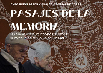 Pasajes de la Memoria es una exposición que reúne la obra de dos artistas de Corral, María Alejandra Ávila y Jorge Bustos Méndez, bajo una acción en común: rescatar del olvido a lugares, personas y sucesos propios de la historia de Corral a través del arte. María Alejandra lo aborda desde la fotografía documental, revelándonos la vida social y cotidiana de un almacén popular que ahora solo existe en sus fotos y la memoria de quienes lo visitaron. Jorge por su parte, lo hace a partir principalmente del Grabado donde recrea escenas de accidentes vividas en la zona. Esta muestra invita a reflexionar sobre la importancia de rememorar: la memoria une, da sentido de pertenencia, identidad y compromete acciones futuras de interés colectivo. La historia, lo cotidiano y la fragilidad de la vida, como fuentes de aprendizaje y valoración de nuestro presente. El sentido de lo futuro en el impulso de nuestros pasos, y nuestro actuar en lo actual.