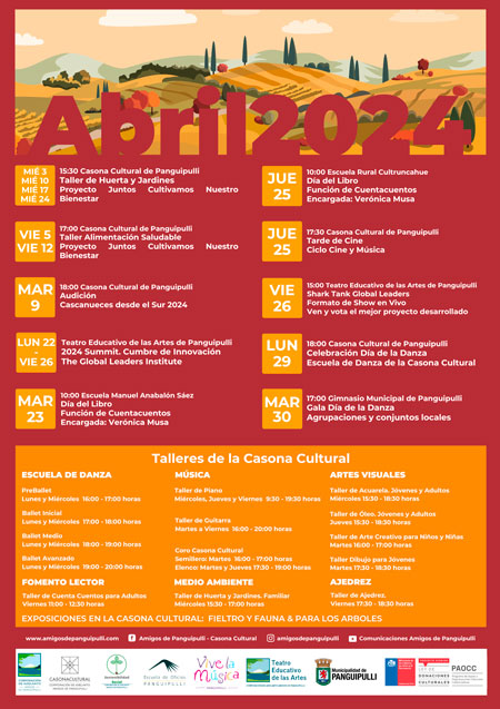 Esta es la programación para el mes de Abril de La Casona Cultural, el Teatro Educativo de las Artes de Panguipulli, el Área de Sostenibilidad y la Escuela de Oficios de la Corporación de Adelanto Amigos de Panguipulli.