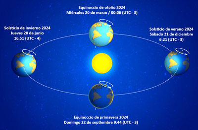 El día domingo 22 de septiembre a las 09:44 (UTC-3), se producirá el Equinoccio de Primavera, en que el día tiene la misma duración que la noche, que corresponde al momento en que los dos polos de la Tierra se encuentran a igual distancia del Sol.