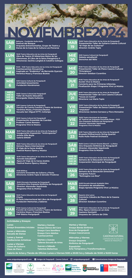 CONOZCA LA CARTELERA DE ACTIVIDADES DEL TEATRO EDUCATIVO DE LAS ARTES Y DE LA CASONA CULTURAL DE PANGUIPULLI PARA ESTE MES DE NOVIEMBRE