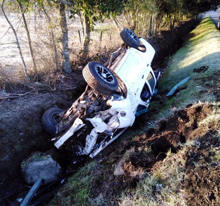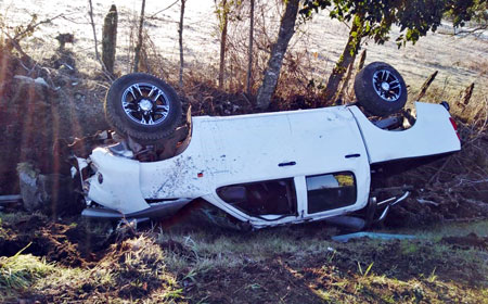 Está el caso de una camioneta blanca, cuyo conductor perdió el control del móvil e impactó con una señalética de tránsito, para terminar volcada al interior de una zanja a un costado de la vía en las cercanías del Cruce Ancacomoe en la Ruta Panguipulli-Lanco, CH-203. La camioneta resultó con daños estructurales de consideración.